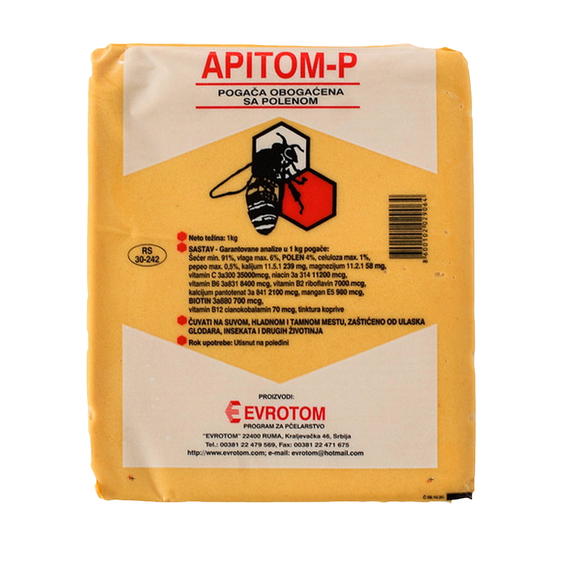 Pogača APITOM-P® je specijalno formulisana za početak i sredinu pčelarske sezone, kada je polen prirodno u manjku. Sa UV sterilizovanim peľom, bogata je vitaminima i mineralima koji omogućavaju pčelama brzo „probuđenje“ i maksimalan razvoj pre proleća.