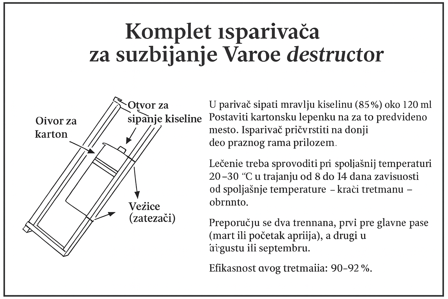 - Upotreba: tretman pčelinjeg društva 85% mravljom kiselinom (protiv varoe)