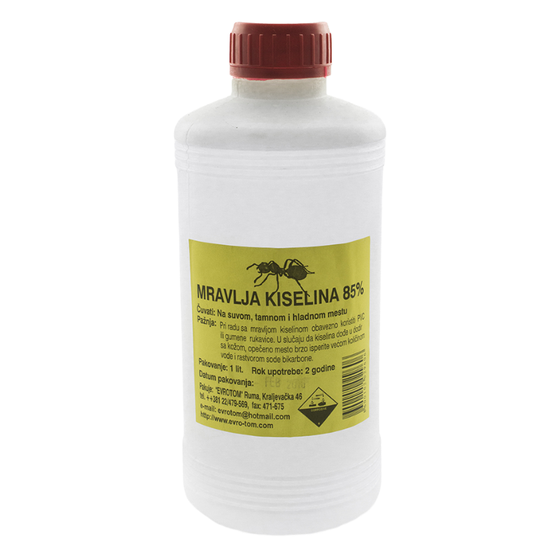 Mravlja kiselina 85% je koncentrisanija varijanta za naprednije protokole tretmana. Obezbeđuje brže isparavanje – obavezno prilagoditi uslovima, tipu opreme i jačini društva.
