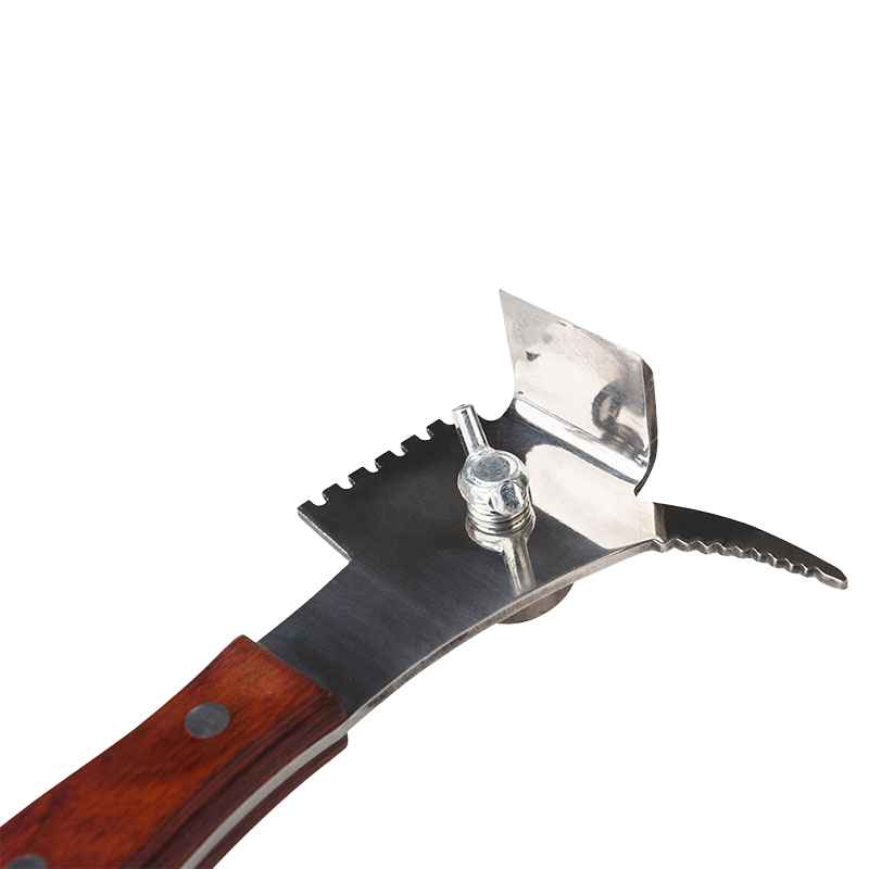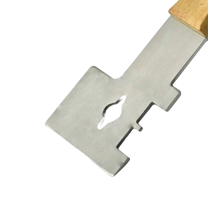Ovaj višenamenski pčelarski nož izrađen je od kvalitetnog nerđajućeg čelika (inox) i obložen drvetom za lakše i prijatnije rukovanje. Namenjen je profesionalnim pčelarima i kombinuje više alata u jednom: